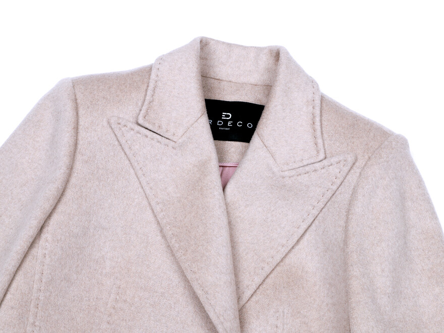 깃은 피크드라펠 디자인인데 아래의 라펠 부분이 위로 뾰족하게 솟아올라 있는 디테일로 당당하고 세련된 여성캐시미어코트의 무드가 느껴진다.