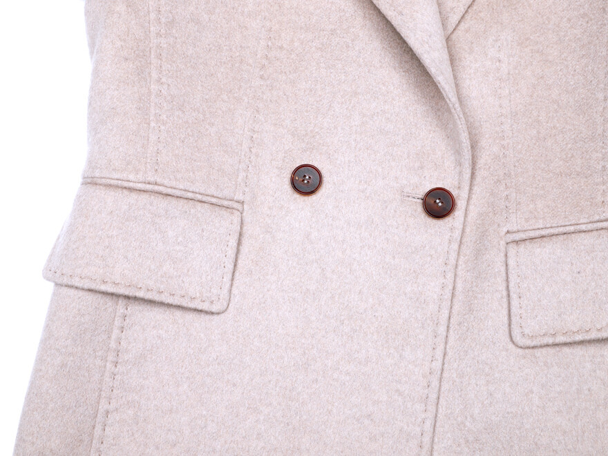 여성캐시미어코트 메인의 오트밀 색상과 부드럽게 잘 어울리는 너트단추는 전체적으로는 레드빛이 살짝 스쳐가는 브라운 계열이면서도 연 베이지 컬러가 옆 테두리면에 보여 답답하거나 무거워 보이지 않고 포근한 이미지도 준다.
