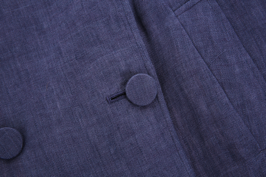 2단 4버튼 더블브레스티드 형식으로 겉감과 동일한 원단의 제천싸개단추 28mm가 앞여밈을 위해 달리며,