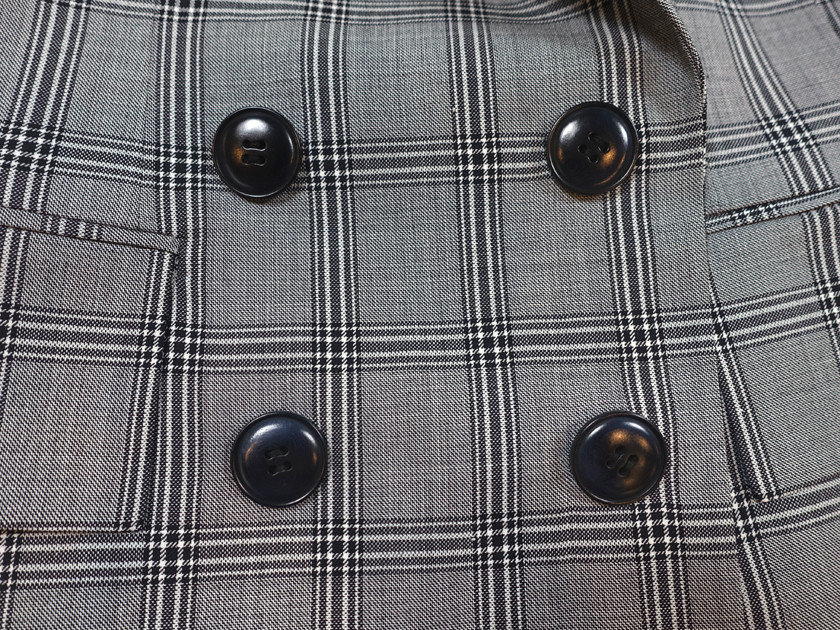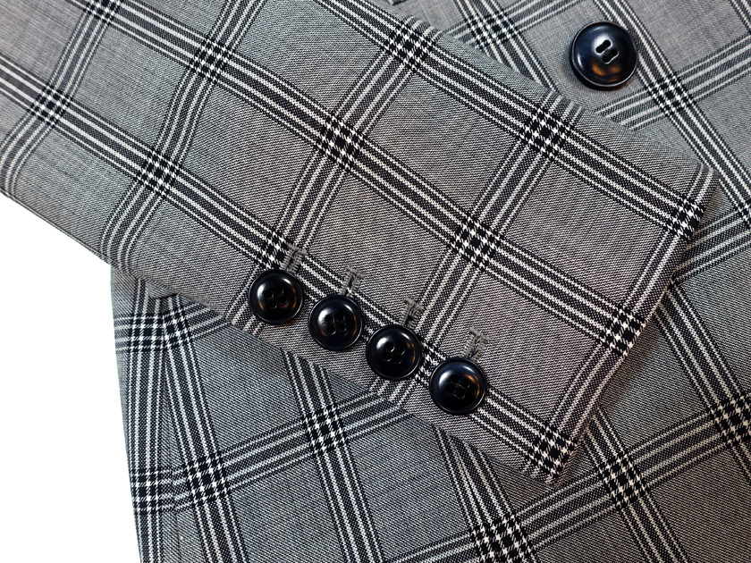 이렇게 디자인된 2단 더블브레스티드 형식의 자켓은 가슴 윗선에 이목을 끌도록 포인트가 되어 상체는 짧고 하체는 길어보이도록 시각적 착시효과를 만들어낸다.