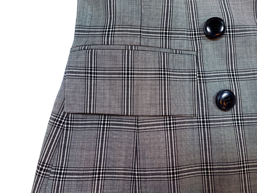 어깨선까지 향하는 와이드 피크드 라펠과 마찬가지로 플랩 포켓 역시 시원한 와이드사이즈이다.
